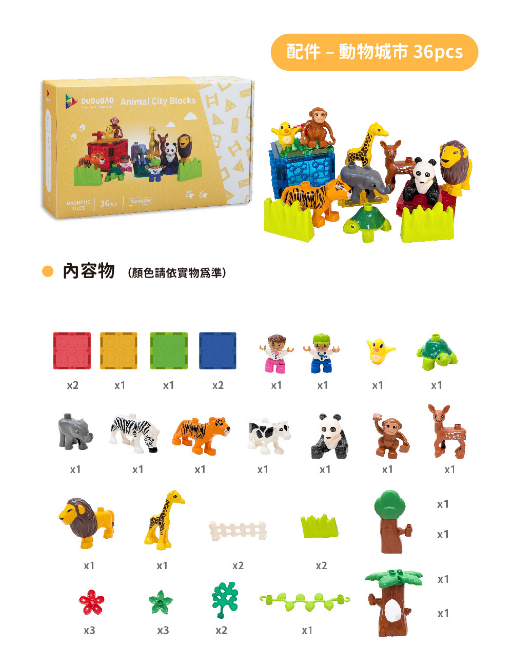 【產品內容】1. 超過10種孩子最熱愛的動物造型積木,外型可愛,色彩艷麗,玩起來愛不釋手。2. 6片大顆粒積木磁力片,可和造型積木自由拼接拆組,來蓋一座厲害的動物園吧!3. 附加樹木、小草、葉子等配飾,增添造景氣氛。4. 2個積木小人配件提供孩子角色扮演,與動物創造情境對話,增進口語表達能力。s