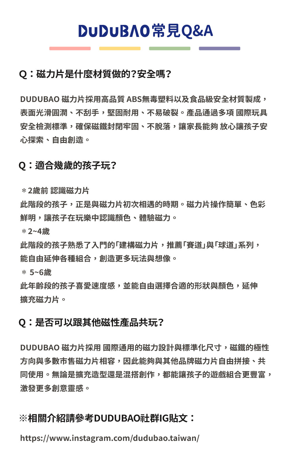 DUDUBAOPlay smart, smart play! 玩轉孩子的想像,讓孩子玩轉未來順著直覺玩樂,滿足孩子的好奇心與成就感我們相信,當孩子主動說出「我想玩!」,就是學習的開始磁力片不只是積木,它是孩子的「想像力練習場」,每一次拼接都能變成新的創作,每一次創造都能發現新的世界。從平面拼圖到立體建構,讓孩子在「玩中創造、玩中探索」。培養出持續挑戰與再造的創造力思維。