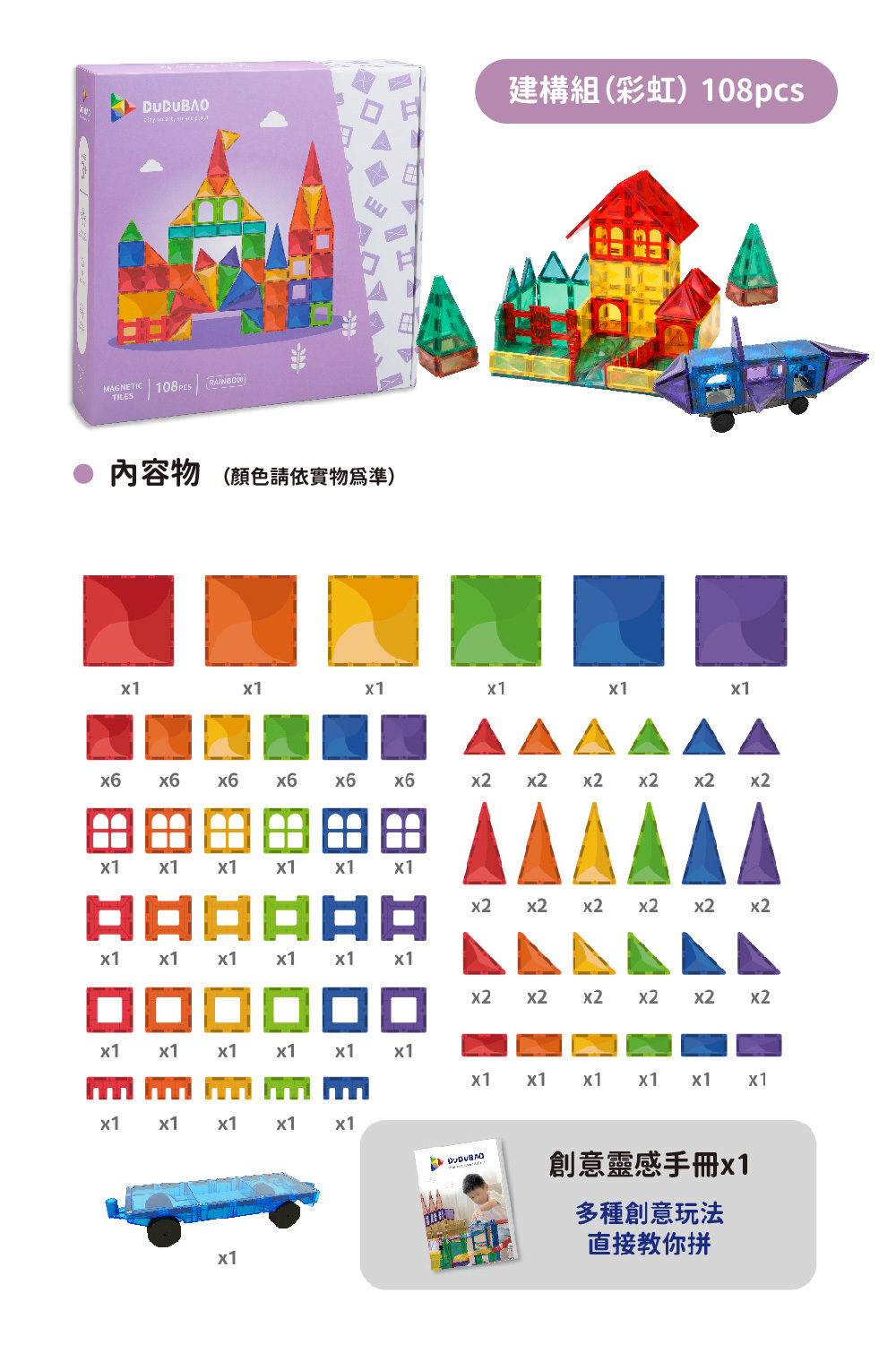 【產品內容】1. 共6種顏色(鮮豔飽和色系)、10種形狀、1台大磁車2. 造型引導手冊1本,內含2D拼圖、3D建構、大磁車等多種玩法介紹s