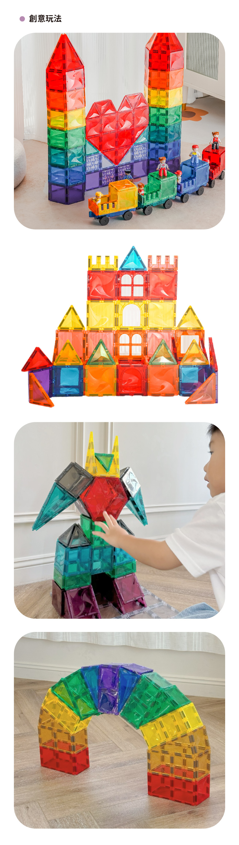 【學習目標】1. 邏輯與結構思維:從形狀辨識到結構堆疊,養成解決問題與推理能力。2. 創造與想像力:每次重玩都有新造型,培養發散思考與創意表達。3. 空間概念:2D到3D建構轉換,提升立體構圖與空間感知。4. 專注與協調力:學習吸附、平衡、排列,增強手眼協調與耐心專注。5. 社交與合作力:與家人、朋友共建作品,促進團隊合作與語言互動。