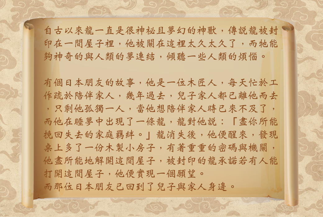 透過不同的提示,和你聰明的大腦,打開龍之屋,就能完成你的心願!