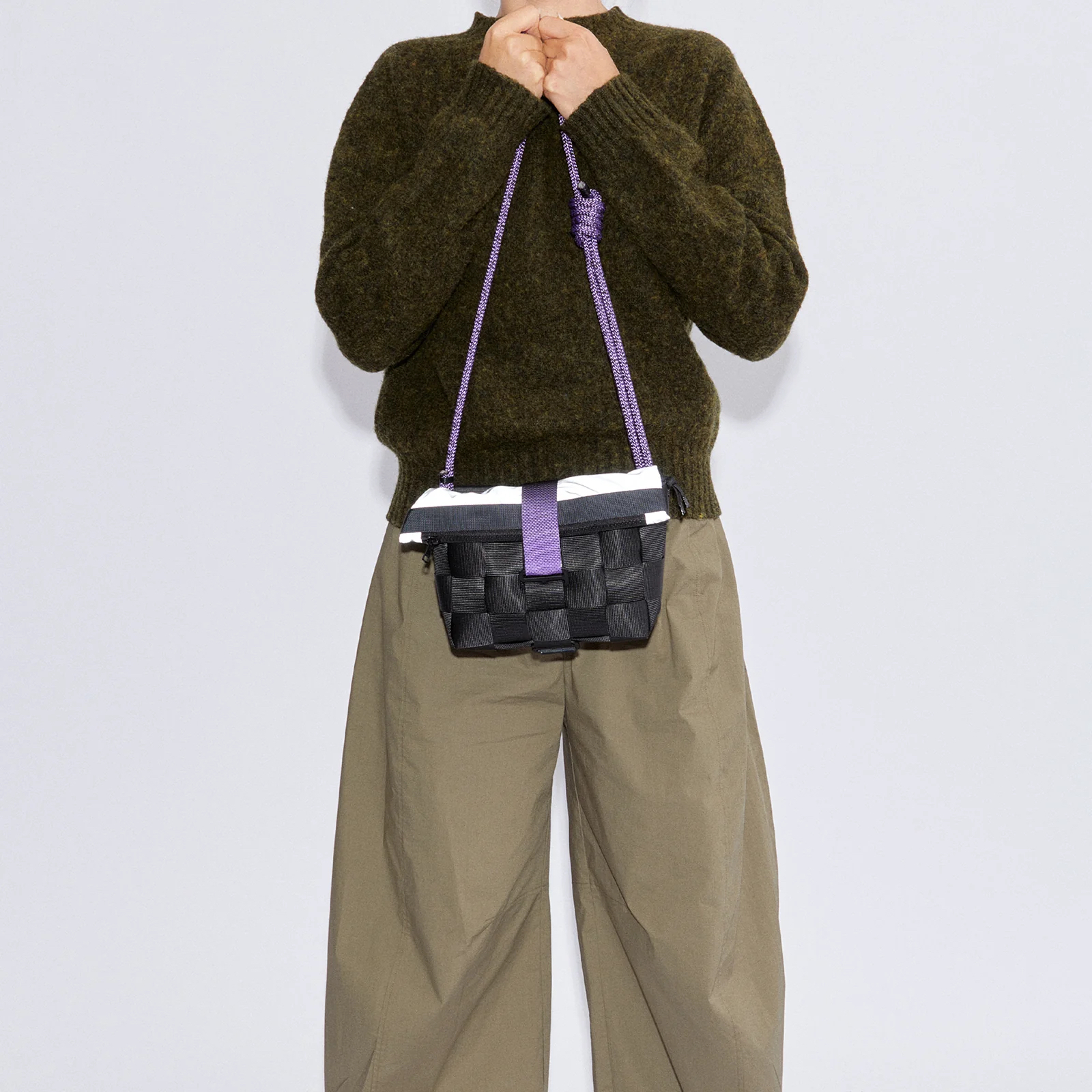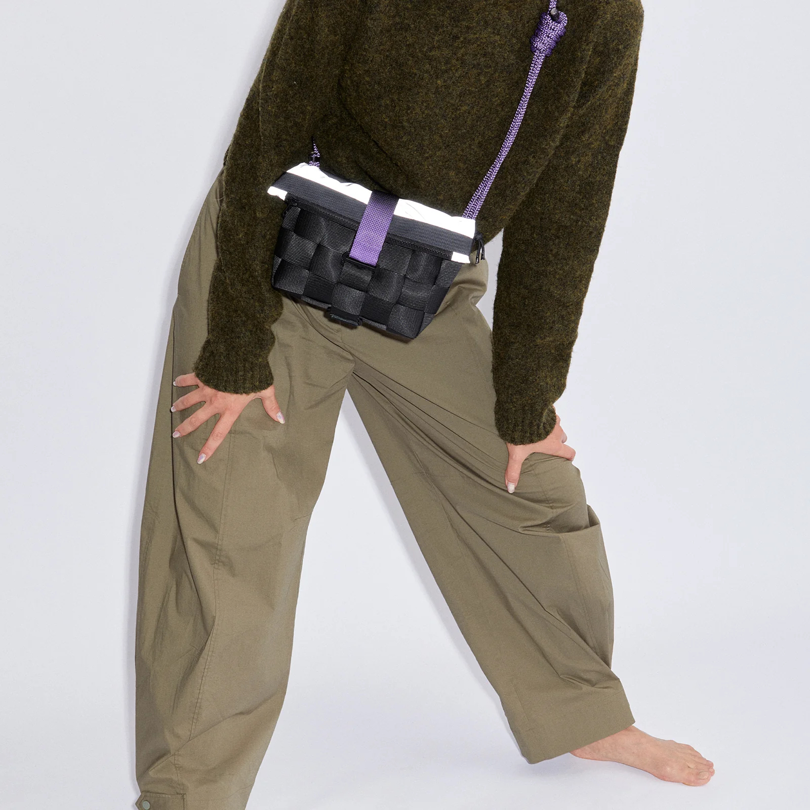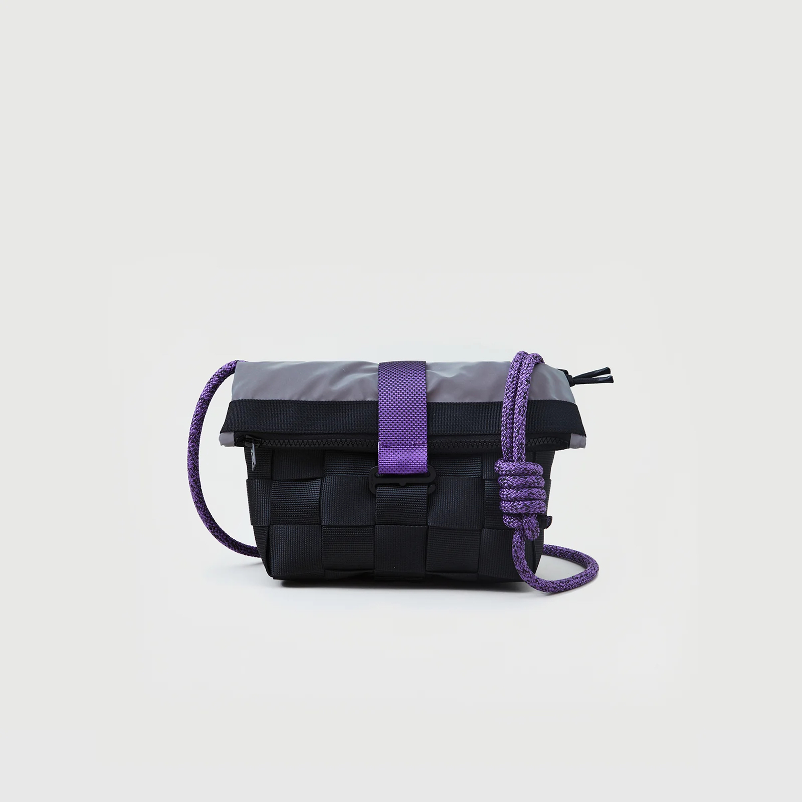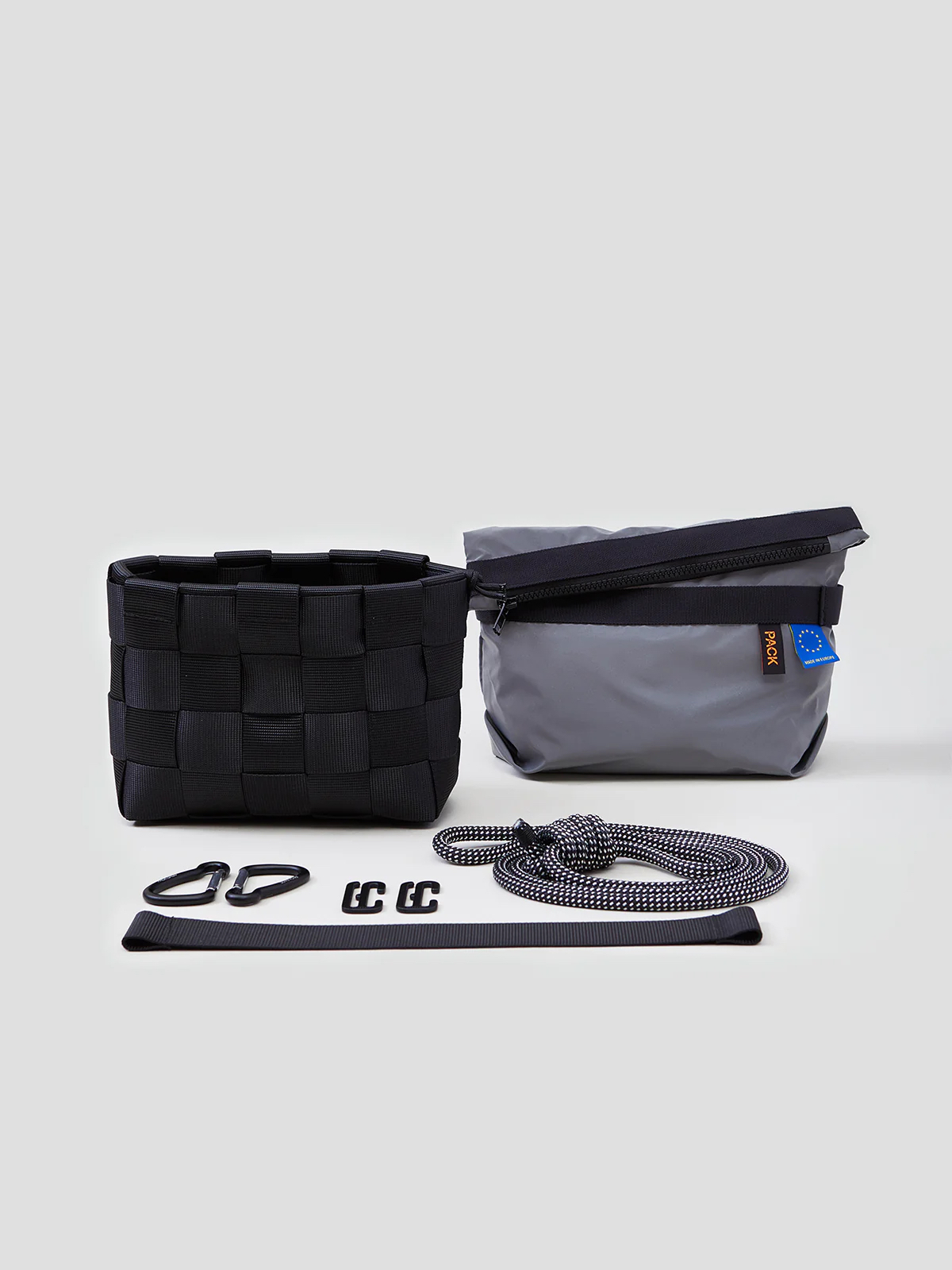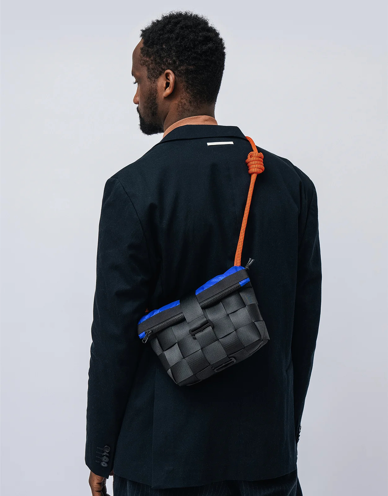 正面採用黑色帶狀材質交錯編織而成,呈現獨特立體紋理與街頭機能感。
