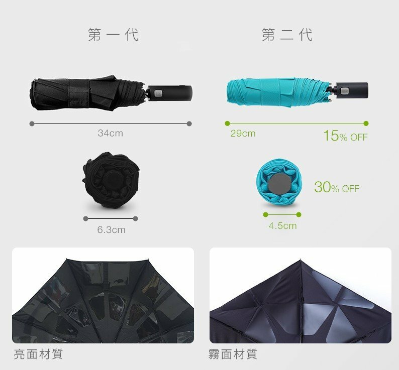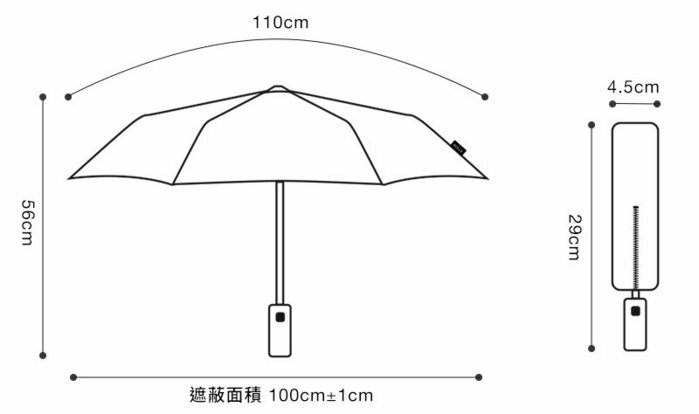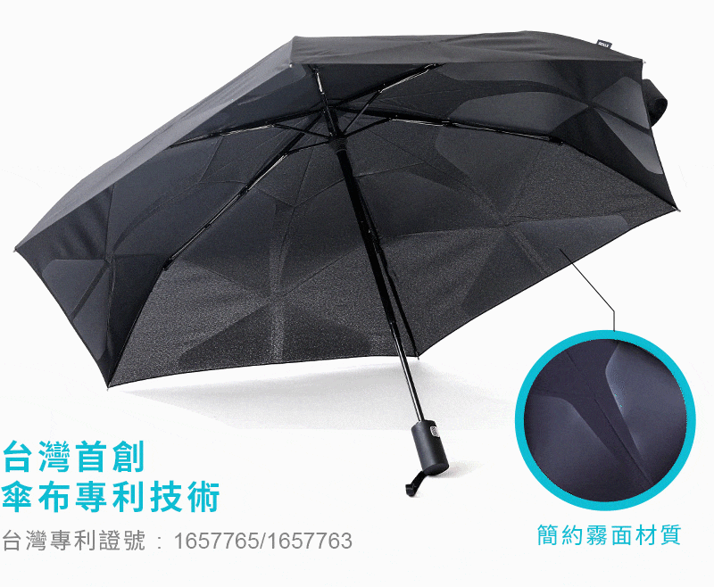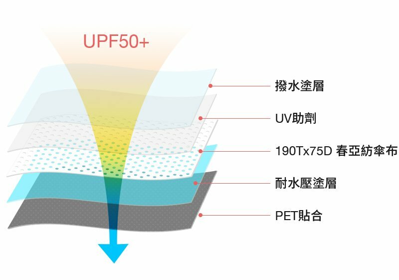 傘布材質:100%聚酯纖維+奈米超潑水+UV塗層+PET塑型膜