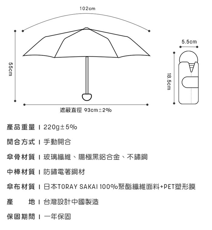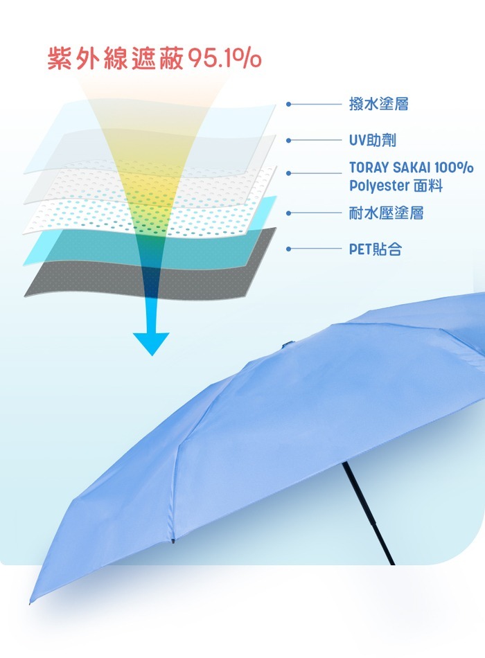 傘布材質:日本TORAY SAKAI 100%聚酯纖維面料+PET塑形膜