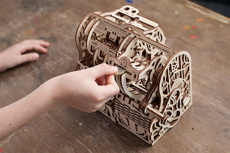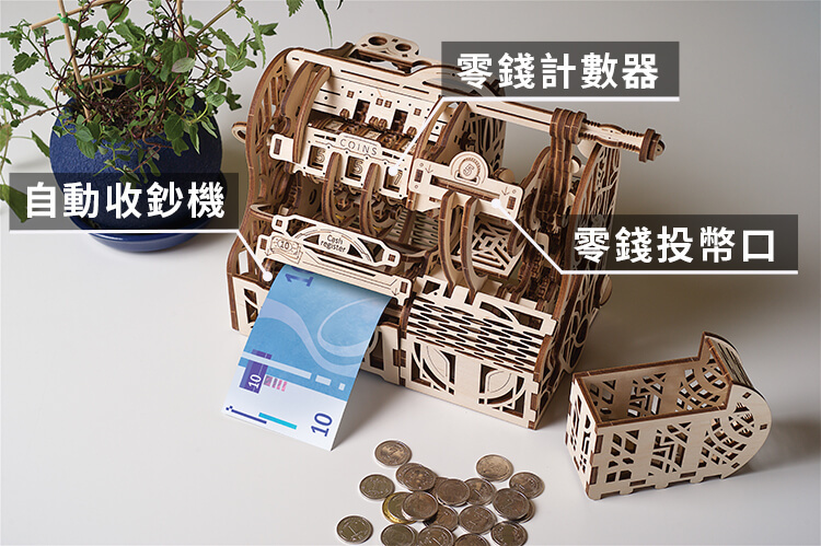 自動收鈔機制(可放入新台幣) - 透過上下拉動槓桿10次就能拉緊橡皮筋馬達,將鈔票對準收鈔口後就能自動吸入鈔票。