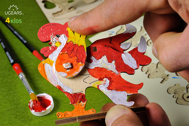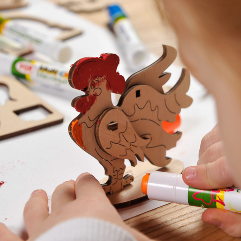 適合5歲以上的孩童組裝,木製零件上已刻上公雞的輪廓,只需照著輪廓塗上你喜歡的顏色。