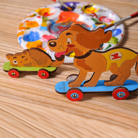 適合5歲以上的孩童組裝,你可以獨自或是跟朋友或家人一起享受組裝及上色的樂趣。木製零件上已刻上貓咪和狗狗溜滑板的模樣,只需照著輪廓塗上你喜歡的顏色